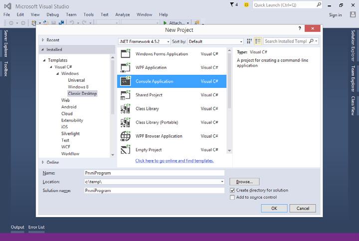 Zobrazí se poměrně pestrá nabídka, protože Microsoft Visual Studio umožňuje vytvářet celou řadu různých typů programů. Vyberte projekt typu Visual C# Windows Classic Desktop Console Application. Do pole Name vyplňte název projektu PrvniProgram. V poli