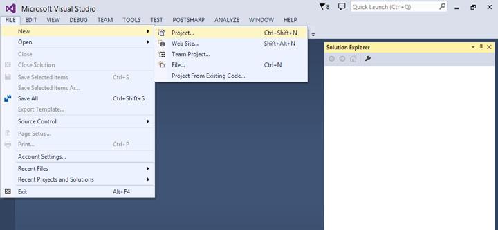 Pokud máte nainstalované vývojové prostředí Microsoft Visual Studio, se můžete pustit do vytvoření svého prvního programu v jazyce C#. Spusťte vývojové prostředí Microsoft Visual Studio. Zobrazí se vám úvodní obrazovka, na které vyberte z hlavního menu možnost File New Project.