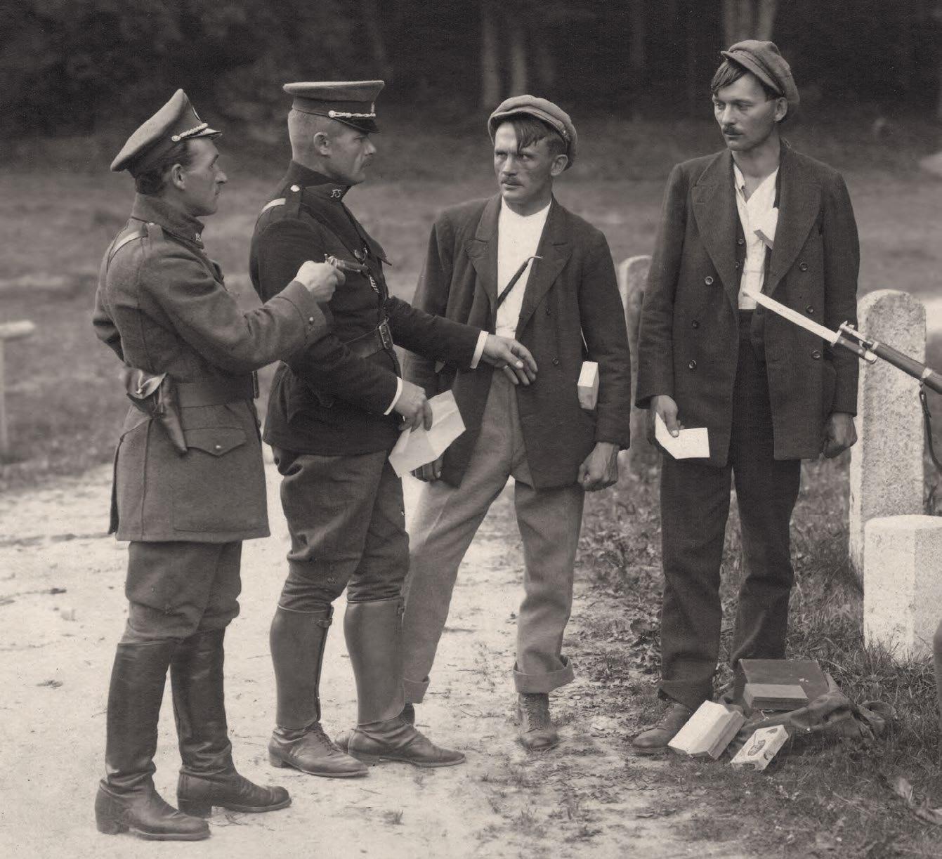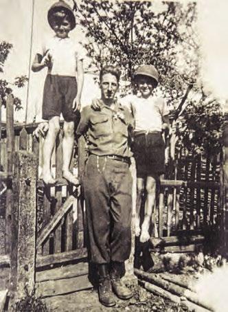 ■ Vpravo: E. K. (na plotě vlevo) s americkým vojákem a starším bratrem Karlem na zahradě jejich domu v Sušici v květnu 1945.