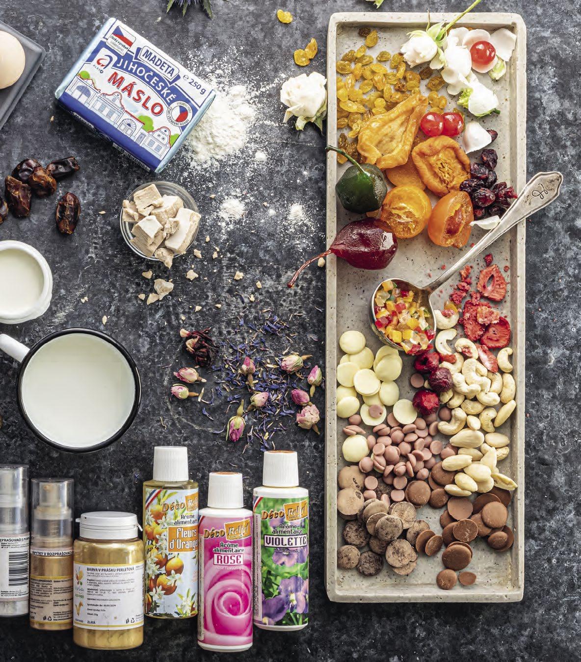 zpracovat s krupicovým cukrem na domácí a aromatický pravý vanilkový cukr. A ještě pár poznámek. Při pečení jsme spotřebovali asi 15 kg másla, 10 litrů plnotučného mléka, 5 litrů smetany ke šlehání, tvaroh, jogurty a snědli jsme asi kilo a půl sýru Madeland z Madety v Českých Budějovicích. To proto, abychom vybalancovali sladkou chuť něčím jiným. A k tomu jsme přikusovali pikantní nakládané okurky od Péťových rodičů. Vajíček padlo asi 150 a všechna byla od super šťastných slepic. Postarala se o ně Péťova babička Emička. Jedlé parfémy, barvy i metalické prášky, které používám, stejně tak jako sušené květiny snadno najdete na internetu nebo také v obchodech se zdravou výživou nebo s čajem či kávou, ale také třeba v lékárnách. Všechny tyhle vychytávky