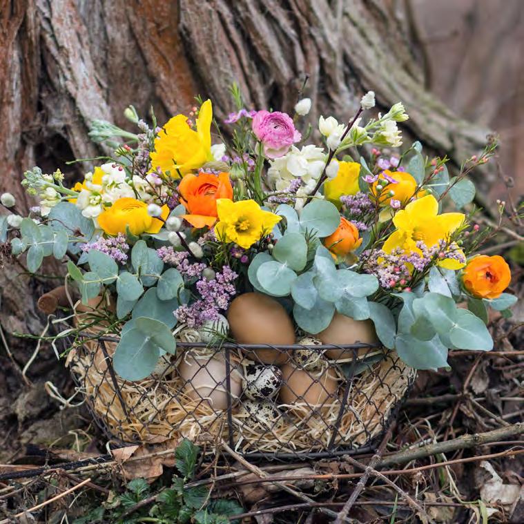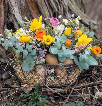 Na výrobu tohoto krásného aranžmá budete potřebovat: menší drátěný košík, plastovou misku, do které umístíte floristickou hmotu (Oasis), nůž, zahradnické nůžky, dřevovlnu a skořápky vajíček. Z rostlinek pak borůvčí, wax, pryskyřníky, narcisy, mathiolu, eukalyptus a statici.