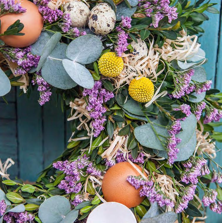 Na výrobu jarního věnce budeme potřebovat: slaměný korpus, zahradnické nůžky, lepicí pistoli, floristický drátek, skořápky vajíček (slepičí i křepelčí), různá přírodní pírka, dřevovlnu, buxus, statici, eukalyptus a craspedii.