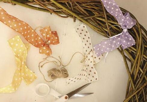 Ze širokých puntíkovaných stuh v ytvoříme mašličky – stuhu poskládáme do požadovaného tvaru a uprostřed svážeme provázkem. Hotové mašličky uvážeme na podkovu