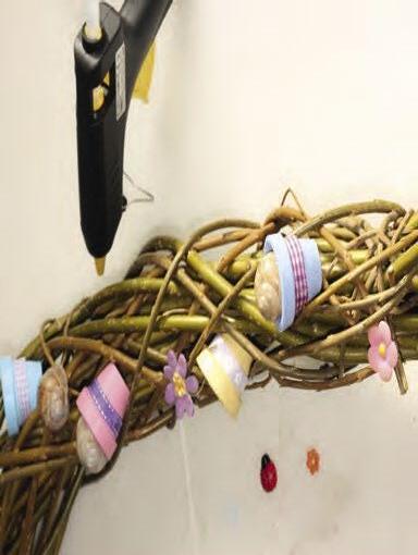 8 Na květináčky nalepíme tavicí pistolí různé stužky.
