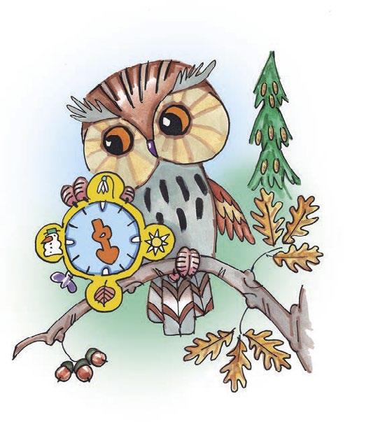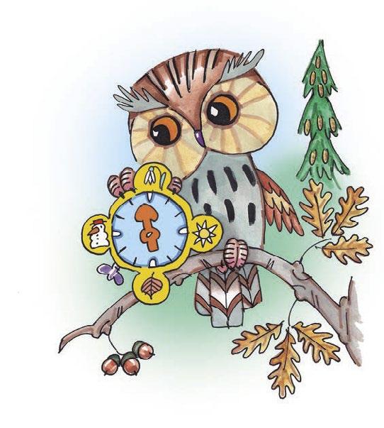 A on tam vysoko na větvi sedí výr Ouško, drží hodiny v pařátcích