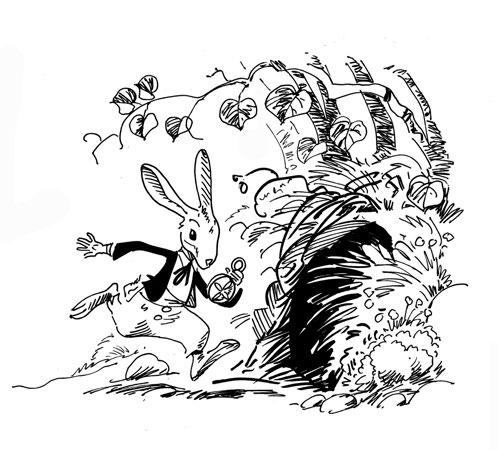 Alice hatte Langeweile; sie saß bei ihrer Schwester am Fluss und hatte nichts zu tun. Plötzlich rannte ein weißes Kaninchen mit roten Augen dicht an ihr vorbei, und sagte zu sich: „O weh, o weh! Ich werde zu spät kommen!“ Alice rannte ihm neugierig nach und sah es in ein großes Loch unter der Hecke schlüpfen.