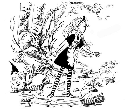 Skočila do díry za ním a padala, jak se zdálo, do hluboké studny. Na stěnách studny visely kuchyňské skříňky a poličky na knihy; tu a tam spatřila mapy a obrazy.