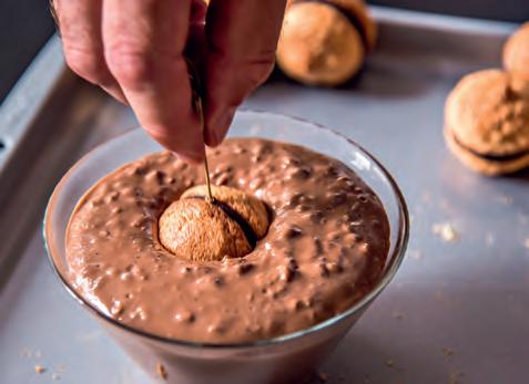 Cukr, šlehačku, arašídové máslo, sůl a kakao přivedeme za stálého míchání k varu, vaříme asi 1 minutu. Sejmeme z ohně a přidáme čokoládu. Dobře rozmícháme. Necháme vychladit a vyšleháme společně s měkkým máslem. Na polovinu buflerů nastříkáme sáčkem se špičkou krém, na něj umístíme několik menších kousků kandované mandarinky a přiklopíme druhým piškotem. Necháme v chladničce dobře ztuhnout. Ze zbylého krému nastříkáme na pečicí papír tři lístky a doprostřed každého vložíme lískový ořech. Necháme v chladničce ztuhnout, poté poprášíme zlatými třpytkami.