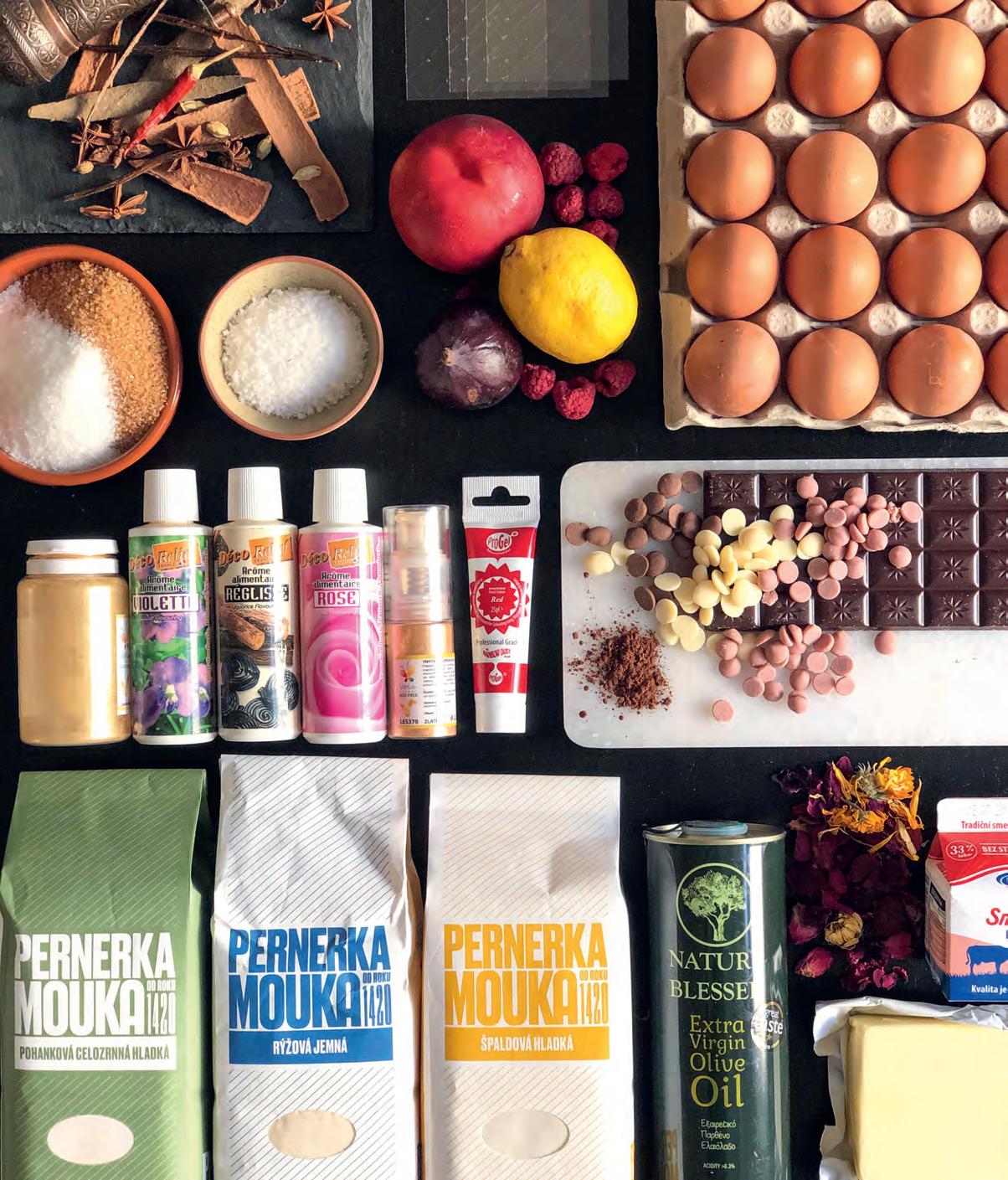 Znovu připomínám: používejte ty nejlepší ingredience, jaké si můžete dovolit. Ošidit se dnes dá kdeco. Chuť ale neoklamete. U nás doma byste těžko našli jiný tuk než máslo a kvalitní olivový či řepkový olej. Vždycky mám po ruce i vynikající Pernerovu mouku, ať už špaldovou, pohankovou anebo nově rýžovou. Mám i velkou zásobu kakaa a čokolády Domori té nejlepší kvality od firmy Monaco Int. – bílé, mléčné, hořké a nově i červené Ruby od Callebaut. Miluju čokolády z Ekvádoru, Peru a Venezuely z plantáže Chuao. Cukr v různých formách a barvách, ovoce sezonní, kandované, sušené mrazem či horkým vzduchem, ve formě domácích marmelád a džemů. K želírování používám želatinu v plátcích, mořský agar či citrusový pektin. Mám vždy domácí či kvalitní vejce a 33% smetanu bez konzervantů – spolu s plnotučným