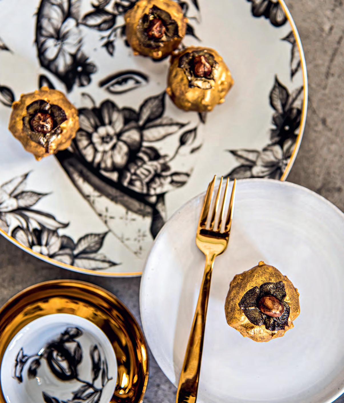 mlékem ji používám téměř do všeho. Mořskou solí a kořením opravdu nešetřím –zvýrazní chuť a špetka skořice či badyánu dokáže i z té nejobyčejnější buchty udělat delikatesu. V malých množstvích používám potravinářské barvy, nejlépe se mi pracuje s těmi gelovými. Metalické prášky v různých formách i barvách a pravé zlato či stříbro doslova a do písmene miluju! Mám rád také sušené či proslazené jedlé květiny – jen tak, potřené tenkou vrstvou bílku či želatiny a prosypané cukrem se třpytkami. Vlašské ořechy, mandle nebo pistácie, zejména pak íránské tmavě zelené, ty v dekorování udělají obrovský kus práce za vás.