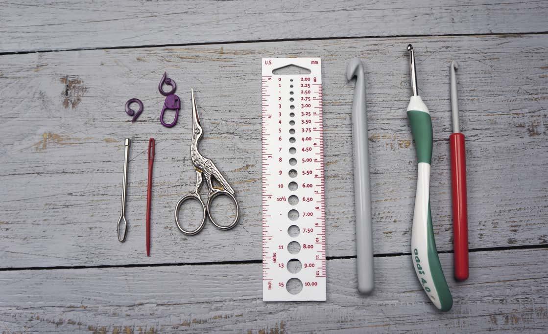 Občas potřebujete při háčkování něco přeměřit a pro tyhle účely se hodí šikovný měřák jehlic. Je to sice měřák na jehlice, ale má na okrajích i pravítko v centimetrech (v mém případě tam mám i údaje v palcích, což se mi hodí, protože pracuji i podle zahraničních návodů, ve kterých se míry v milimetrech neuvádějí).