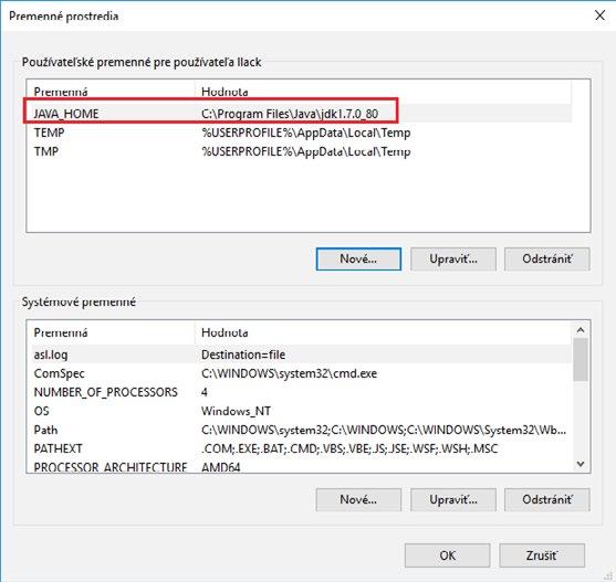 Pokud Android Studio nenajde vámi nainstalované JDK, je potřeba nastavit ještě uživatelskou proměnnou JAVA_HOME , aby aplikace používající JDK mohly správně pracovat. V systémových nastaveních Windows 10 klepněte na Rozšířená systémová nastavení a v zobrazeném dialogu klepněte na tlačítko Proměnné prostředí. Přidejte novou uživatelskou proměnnou JAVA_HOME a do ní textový řetězec adresáře, ve kterém máte nainstalované JDK.