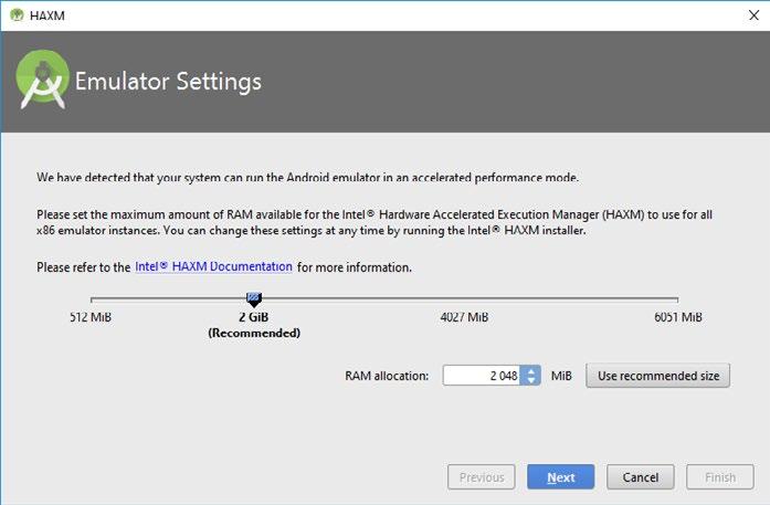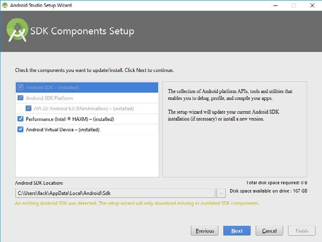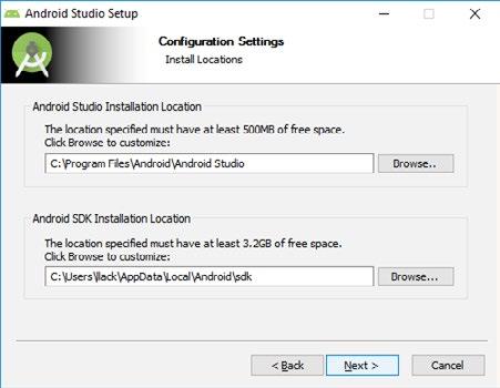 V následujícím dialogu se zobrazí složky, do kterých se nainstaluje Android Studio a Android SDK.
