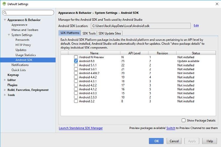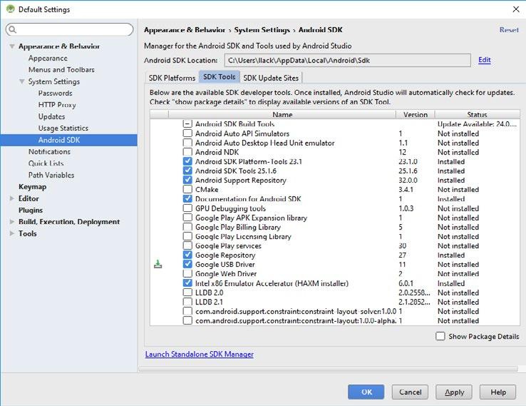 Obrázek 1.8: Android Studio – implicitní adresáře k instalaci