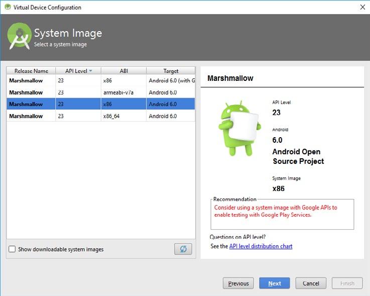 Následuje výběr verze operačního systému. AVD Manager vám nabídne verzi, která nejrychleji poběží na vašem vývojářském počítači. V našem případě jsme ponechali implicitně vybranou volbu x86, přestože originální zařízení má procesor Exynos nebo Qualcom Snapdragon s architekturou ARM.