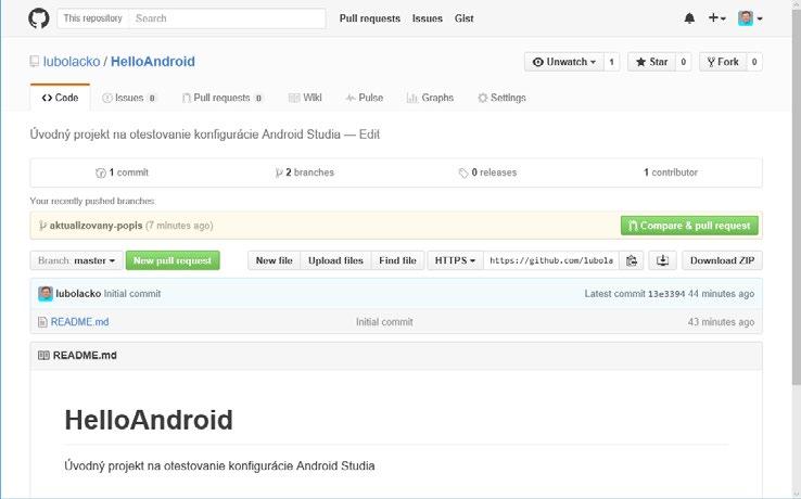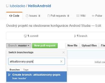 Po tomto úkonu máte v repozitáři dvě větve, v našem případě „master“ a „aktualizovany-popis“. Zatím jsou stejné. V reálném projektu můžete provádět změny v nové větvi, aniř by se tyto změny promítly do větve master.