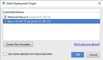 Po potvrzení zadaných parametrů se emulátor přidá do seznamu. Pro účely této publikace doporučujeme vytvořit dva emulátory, oba pro verzi Android 6.0 Marshmallow (API Level 23) nebo 5.0 Lollipop: jeden emulátor telefonu s úhlopříčkou 5 palců a rozlišením 768 × 1280, druhý emulátor tabletu s úhlopříčkou 7 až 10 palců a rozlišením full HD 1 920 × 1 080 pixelů nebo vyšším. Pokud označíte možnost Store a snapshot for faster startup, druhé a další spuštění emulátoru proběhne velmi rychle, protože AVD po zavření uloží svůj aktuální stav. První spuštění emulátoru trvá trochu déle, u dalších spuštění je už doba náběhu přiměřená. Při vytváření emulátoru nezapomeňte nakonfigurovat dostatečnou kapacitu paměti RAM, úložného prostoru a případně i SD karty, pokud ji bude aplikace využívat.