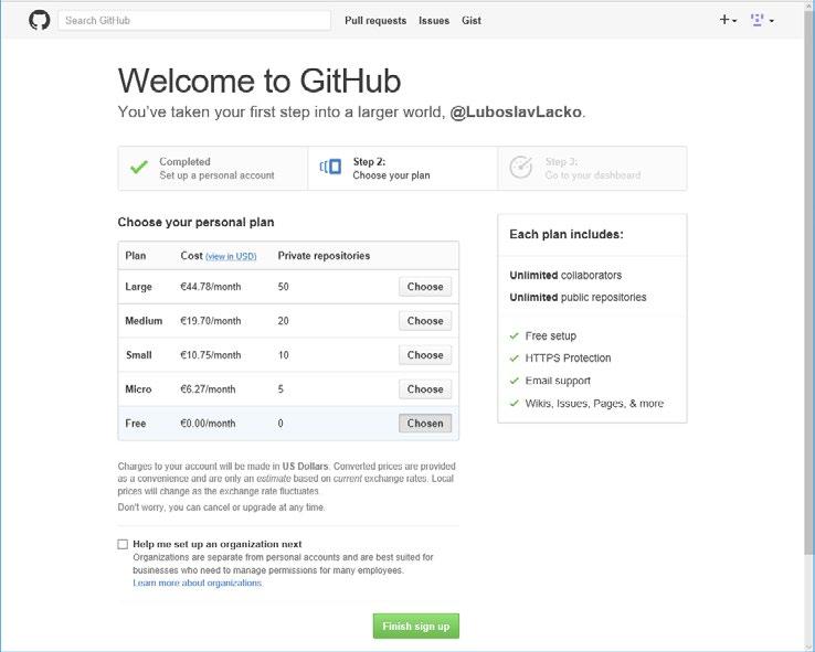 Jak už bylo zmíněno, základní varianta s veřejnými repozitáři je zdarma. Cena placených variant se odvíjí od počtu privátních repozitářů. Všimněte si, že pro každý plán poskytování služby, včetně bezplatného, můžete vytvářet neomezený počet repozitářů a není omezen ani počet participujících na jednotlivých projektech.