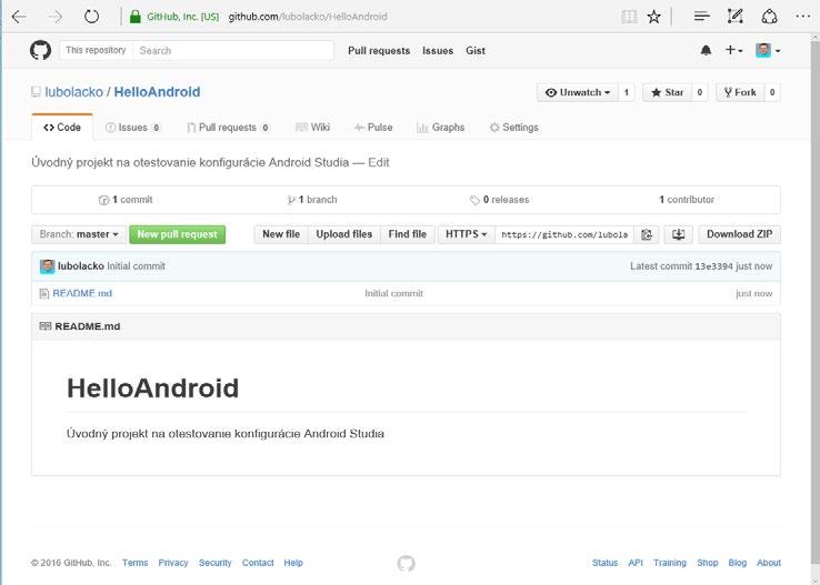 Všimněte si volby Initialize this repository with a README . Pokud ji zaškrtnete, vytvoří se v novém repozitáři soubor README.md. Při seznamování se s GitHubem aktivací této volby de facto zařídíte, že repozitář bude obsahovat aspoň jeden soubor a bude s ním možné pracovat. Zároveň se pro takovýto nyní už plnohodnotný repozitář, i když jen s jedním souborem, vytvoří klon na vašem počítači. Pokud volbu neoznačíte, musíte si první soubory nahrát do repozitáře sami. Tlačítkem Create repository vytvoříte nový repozitář.