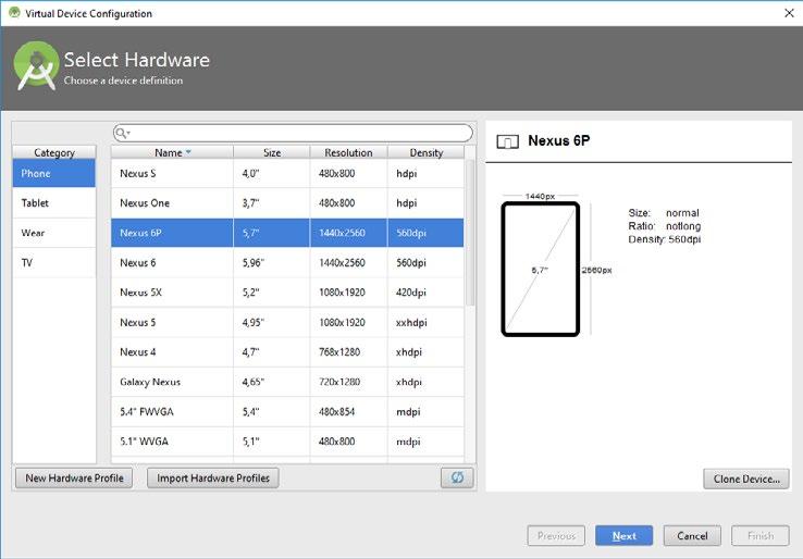 Tlačítkem Create Virtual Device vytvořte nový emulátor požadovaného zařízení. V dialogovém okně na vytvoření emulátoru jsou předdefinovaná zařízení rozdělena do kategorií. K dispozici jsou kategorie Phone, Tablet, Wear a TV. Buď si vyberete některé z předdefinovaných zařízení a tehdy doporučujeme vhodný Nexus s čistým Androidem, nebo pokud máte speciální požadavky, například potřebujete více či méně paměti RAM, vytvořte emulátor požadovaného zařízení klonováním.