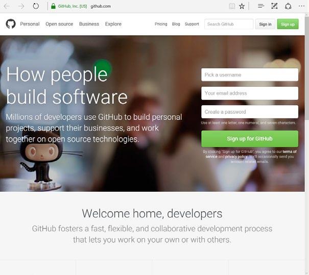 Vstupním bodem služby je stránka www.github.com. Na vytvoření účtu stačí zadat přihlašovací jméno, e-mail a heslo.