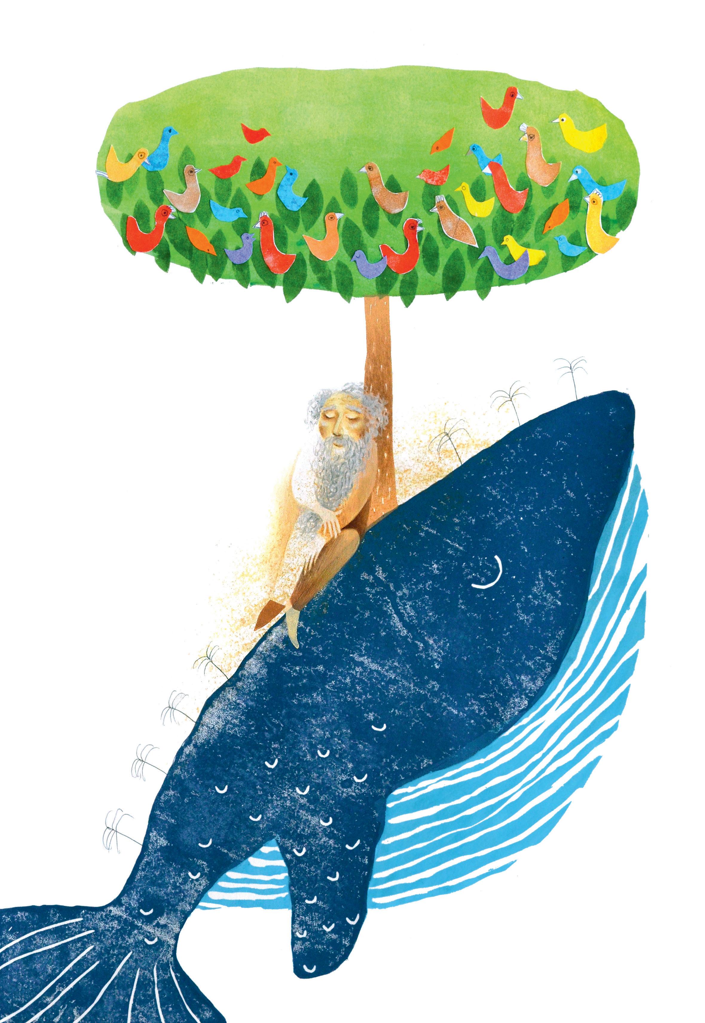 Prvních pět tisíc let se zapisovač pohádek jen tak díval z okna paláce. Po vodní hladině běžela jedna vlna za druhou. Nenapadlo jej vůbec nic. Sedl si tedy do křesla. Se zavřenýma očima čekal, zda by za ním nepřišla nějaká pohádka v dřímotách. Nepřišla! Zapisovač pohádek byl pracovitý chlapík ze staré školy. Nerad zahálel. „Prozatím budu aspoň zapisovat, kolikrát se velryba ve spánku převalí z boku na bok,“ umínil si. Velryba se ukázala jako silný spáč. Nepřevalila se ani jednou. Tak uplynula nějaká doba. Odhaduji, že celkem devět tisíc let. Jednou po deváté hodině ranní přinesl vítr maličké semeno. Odkud přiletělo? To právě nikdo neví. Padlo zapisovači otevřeným oknem přímo na stůl.