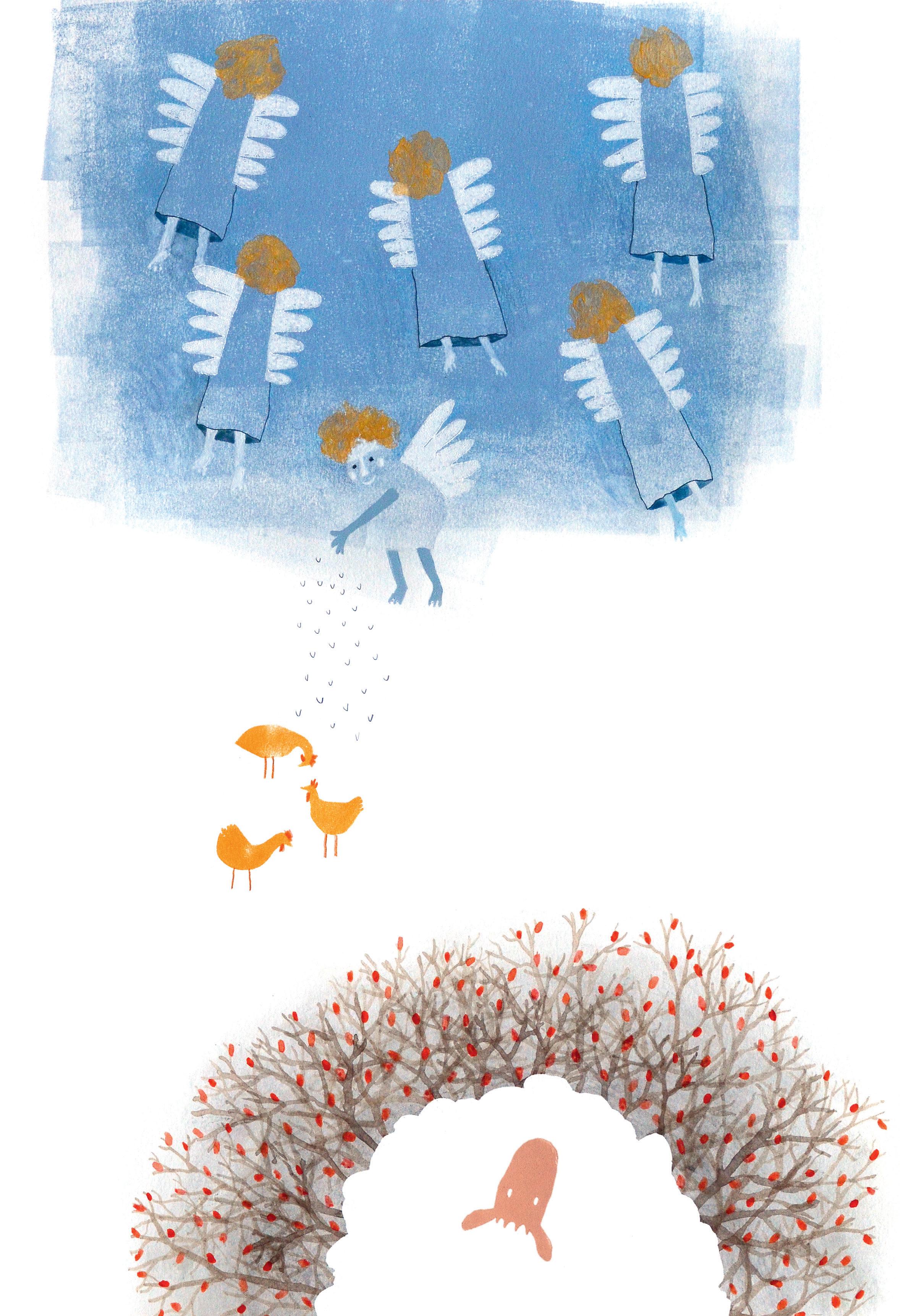 Jednou letěl kolem anděl. Zůstalo po něm jenom trochu sněhobílého peří. A mezi slepičí vajíčka se přikutálelo i jedno andělské. Leželo na slámě, svatě zářilo. Kvočna vyseděla s kuřátky i pěkného anděla. Jmenoval se Engelbert. Jako slepice byl Engelbert naprosto k ničemu. Nechtěl zobat zrní, neuměl snášet vejce, vzpíral se hrabat se slepicemi na hnoji, odmítal sezobnout červa. „Je živý! Kroutí se!“ volal Engelbert. „Jdi od nás pryč,“ řekla mu kvočna. „Vždyť ty se nehodíš ani do hrnce na slepičí polévku. Křídla máš jako my, ale slepice nejsi!“ S provinilou tváří kráčel Engelbert po silnici. Slzy mu kapaly do prachu. Styděl se. Dlouhá andělská křídla měl ucouraná. Vypadal teď trošičku jako skutečná slepice. Ale nebyl.