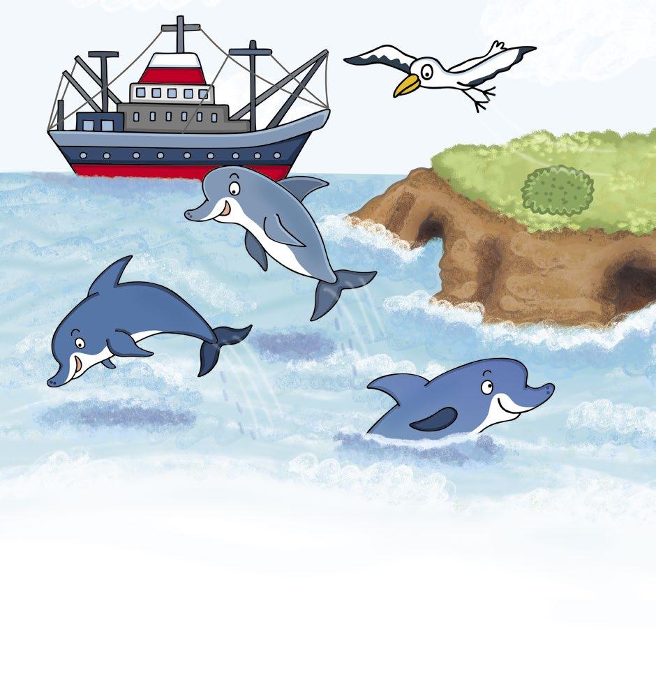 Skákali a dováděli, pískali a pouštěli bublinky. Ani si nevšimli, že v zátoce pláče malý delfínek. Jmenoval se Ploutvička.