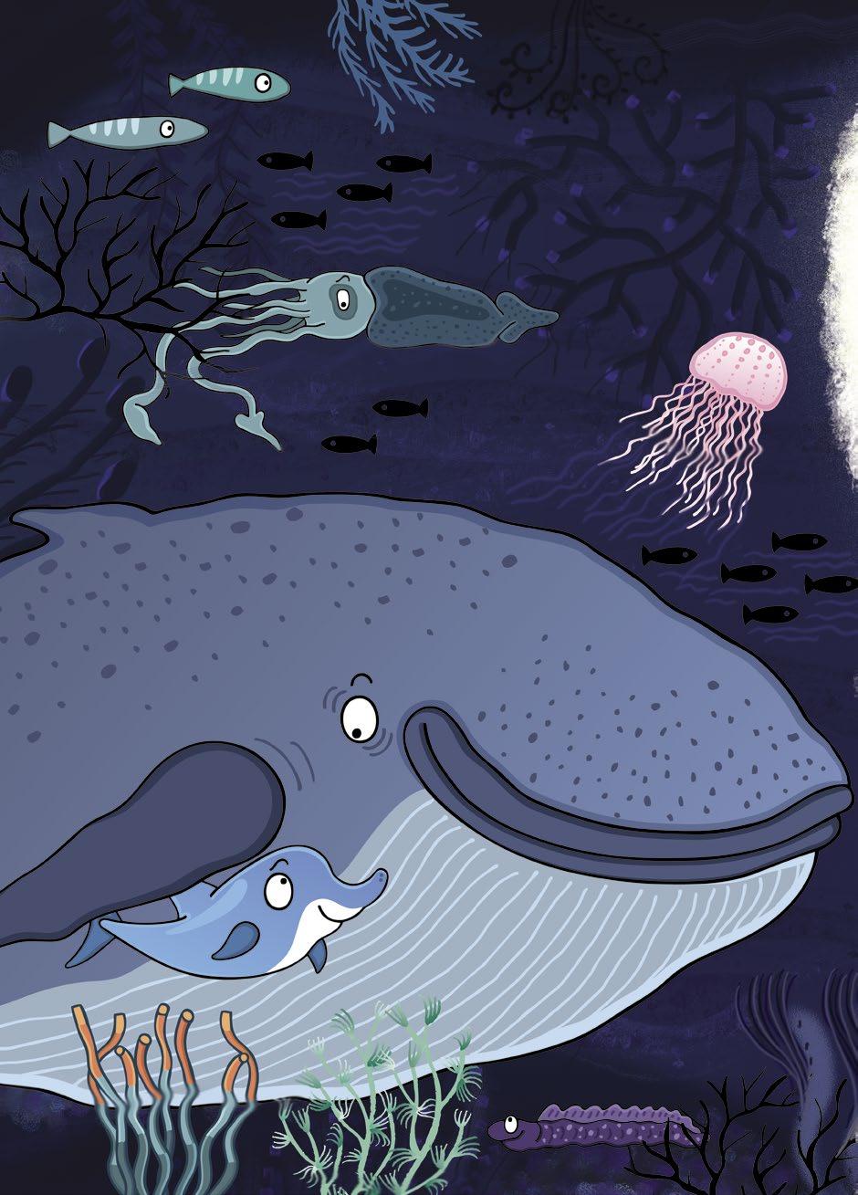 Delfínek si utřel slzičky, schoulil se velrybě pod ploutev a zaposlouchal se do jejího tajemného vyprávění.