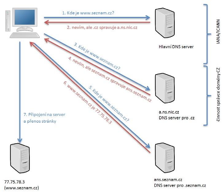 Ve zjednodušené podobě lze systém DNS popsat jako systém neustálé komunikace mezi počítači a DNS servery, které dotazující se počítač postupně směřují k vybranému cíli.