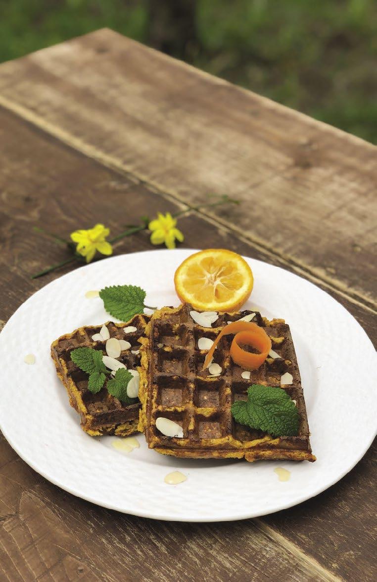 Mrkev nastrouháme na jemno, smícháme s ostatními ingrediencemi nebo vše dáme do mixéru a mixujeme do hladší hmoty. Plníme vaflovač, a jakmile jsou vafle hotové, podáváme posypané plátky mandlí, zakápnuté medem.