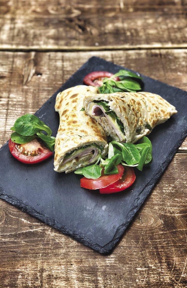 Metličkou vypracujeme těsto do hladka. Pokud je těsto hustší, přidáme lžíci vody a necháme chvilku odpočinout. Poté opékáme na sucho na nepřilnavé pánvi z obou stran. Potřeme čerstvým sýrem se sníženým obsahem tuku (např. Lučina Linie), poklademe listy polníčku, špenátu nebo rukoly, šunkou a sýrem.