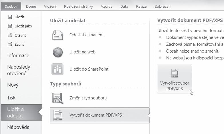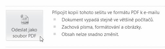 Uložení sešitu ve formě PDF. Pokud budete chtít svoje tabulky poslat ve formě PDF (tedy v neupravitelné podobě) například e-mailem, pak můžete celý sešit exportovat právě do tohoto formátu. Provedete to následovně: