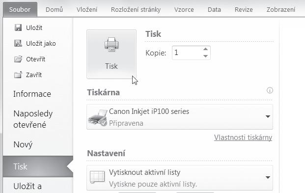 Rychlý tisk sešitu. Jestliže si budete chtít výslednou tabulku vytisknout místo posílání e-mailem nebo využití v jiných dokumentech, pak zvolte kartu SOUBOR a v ní příkaz TISK.