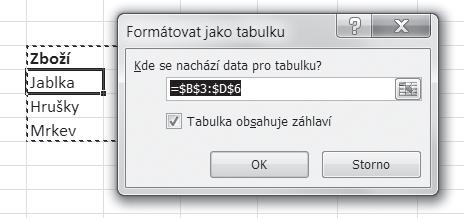 4. V zobrazeném dialogu zaškrtněte políčko TABULKA OBSAHUJE ZÁHLAVÍ, pokud chcete, aby se první řádek tabulky použil jako záhlaví s názvy sloupců. Pokud políčko nezaškrtnete, Excel vytvoří v tabulce záhlaví sám, které si později můžete upravit.