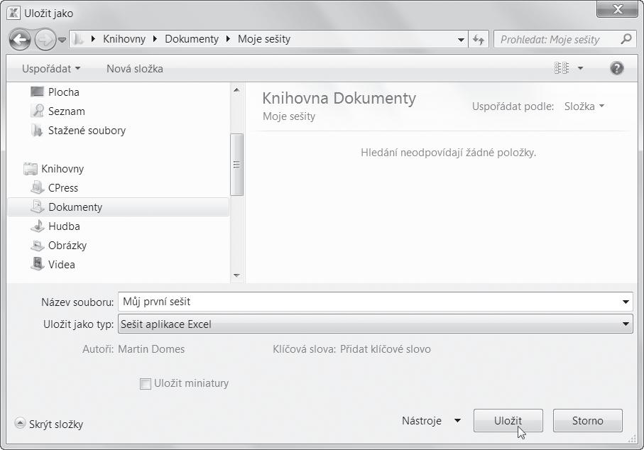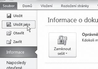 Uložení sešitu. Rozpracovaný sešit je dobré si co nejdříve uložit (ještě dříve než práci dokončíte), abyste nepřišli o data například při výpadku proudu. Uložení je samozřejmě potřeba, pokud se budete chtít k sešitu Excelu později vrátit. V případě prvního uložení sešitu postupujte takto: