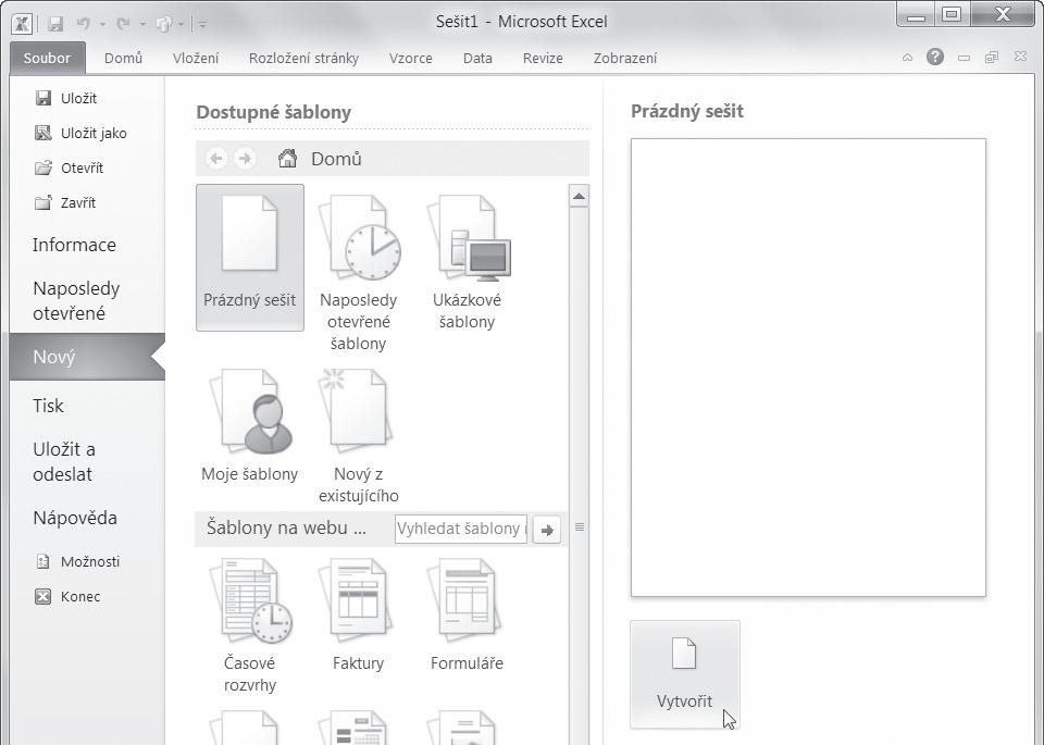 3. V části DOSTUPNÉ ŠABLONY nechte vybraný PRÁZDNÝ SEŠIT a v pravé části nabídky stiskněte tlačítko VYTVOŘIT.