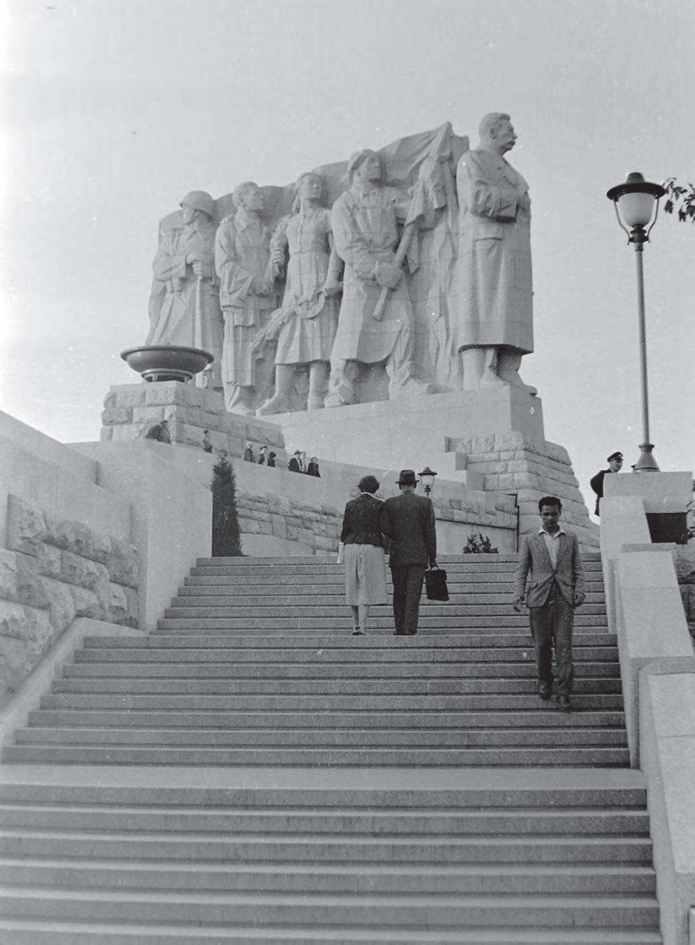 Monument byl slavnostně odhalen 1. května 1955 pod heslem „Svému osvoboditeli československý lid“. Ve své době šlo o největší a nejdražší sousoší v Evropě. Stalin však mezitím zemřel a zanedlouho Chruščov odsoudil jeho kult osobnosti, po čemž následoval rozkaz pomník zlikvidovat. Zjistilo se, že nejlevnější bude jej vyhodit do povětří, a tak v listopadu 1962 začalo odstřelování za „přísného utajení“, které bylo zajištěno zakrytím pomníku dřevěným bedněním. Bourání bytelně postaveného sousoší trvalo sedm týdnů a poté vyvstala otázka, co s volným prostorem a také co s podzemím, kde plány původně počítaly s mauzoleem nebo reprezentativními prostory, jenže k naplnění záměru nikdy nedošlo.