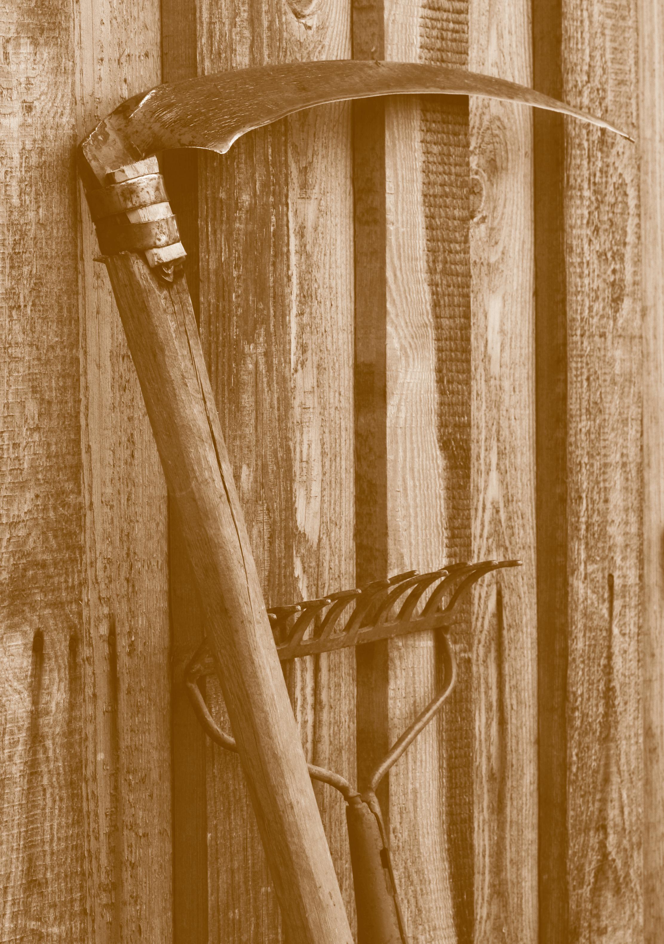 U místního truhláře jsem si nechal vyrobit oblouk pro jednu z mých kos, který se připojuje ke kose, aby po starém způsobu sbírala pokosené obilí a pokládala ho na zem pro snadné vázání. Ta moje kolébka byla ve stylu velkých hrábí, jaké jsem viděl na obrázcích z období hospodářské krize.