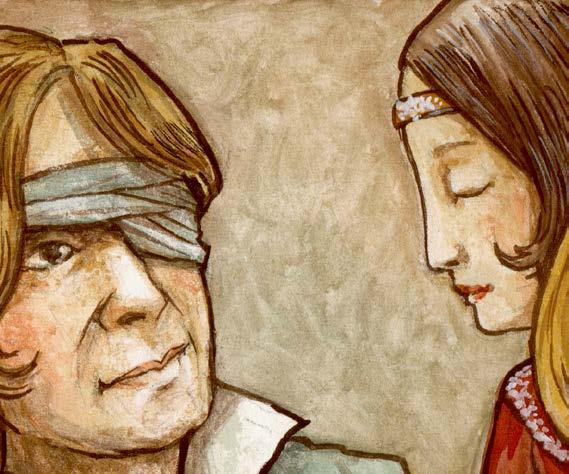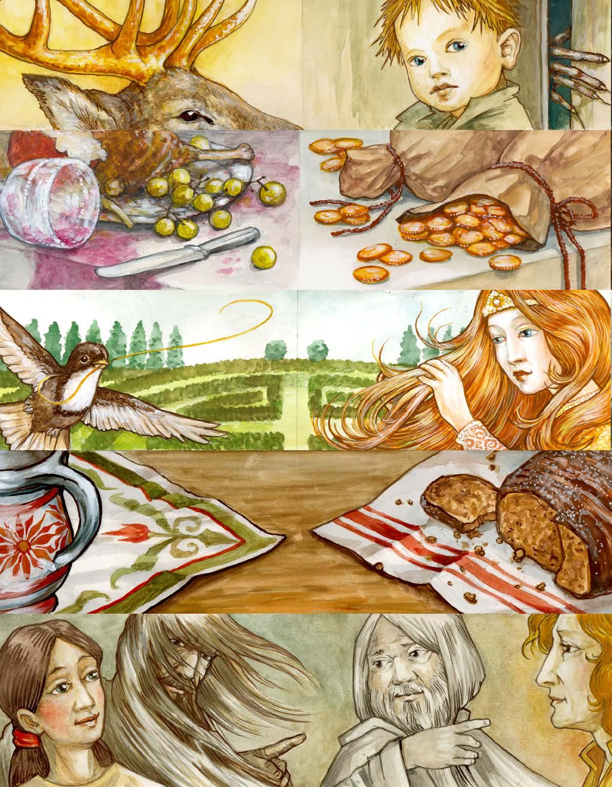At that moment two little birds flew in through the window. They were chasing and fighting over three golden hairs, which one of them was holding in his beak,