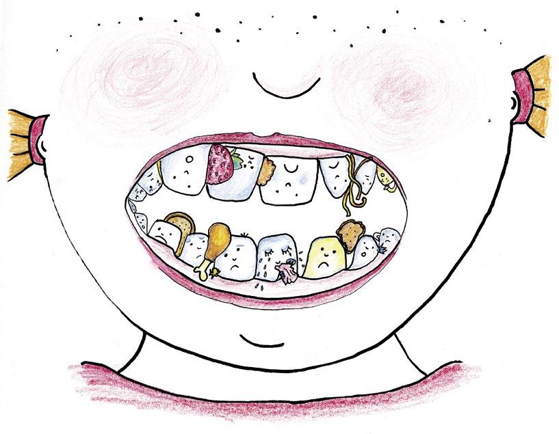 Sofince se postupně začaly mezi zoubky usazovat zbytky jídla: kousek jahody z koláče, ždibíček kuřete z večeře a drobečky chleba od svačiny.