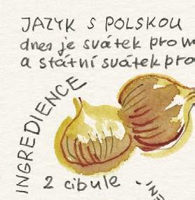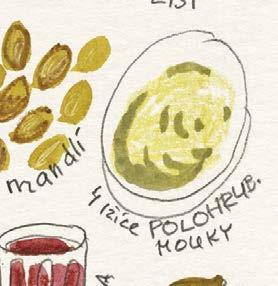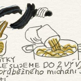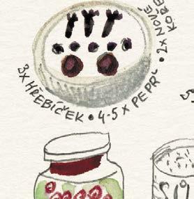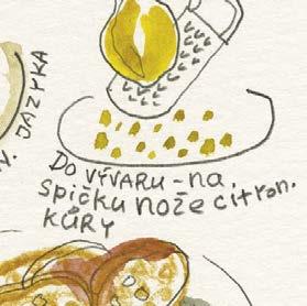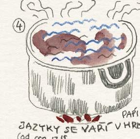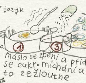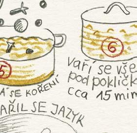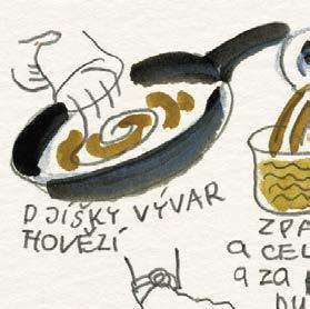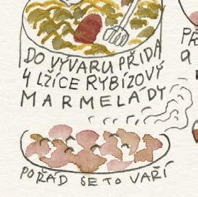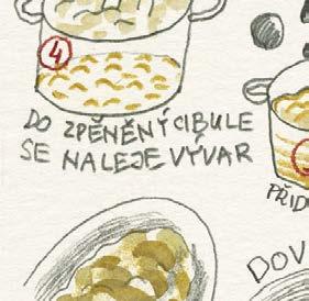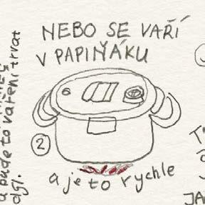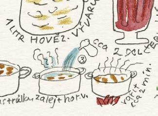 Dělal jsem naoko, že se trochu zlobím, ale chápu to. Pro dobrý výsledek vaření to tak musí být. A mně zase nedalo nikdy moc práce sáhnout do ošatky pro jednu cibuli a nakreslit si ji tak, jako by ještě ležela nenakrájená na kuchyňské lince. Jinak jsou ale všechny kreslené recepty a obrázky v knížce tak, jak byly zachyceny do bloku, bez retuší nebo úprav. Přepisem kreslených receptů jsme se jen snažili uspořádat to nakreslené do přehlednější podoby, ale právě tak jako tady platí: „co je psáno, to je dáno“, platí u obrázků, že: „co je nakresleno, to je prověřeno“.