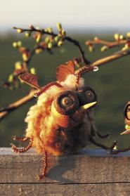 Připravte si: polystyrenové kuličky o Ø (průměru) 3 a 2 cm, vázací drát, tenký kulatý šroubovák, drobné korálky, dva odstíny proužků plyše nebo chlupatých drátků, univerzální lepidlo, tavnou pistoli, kulaté párátko, dvě menší bukvice, akrylovou barvu, štětec, lihový fix, nůžky, papír nebo javorové nažky (nosy) na křidélka.