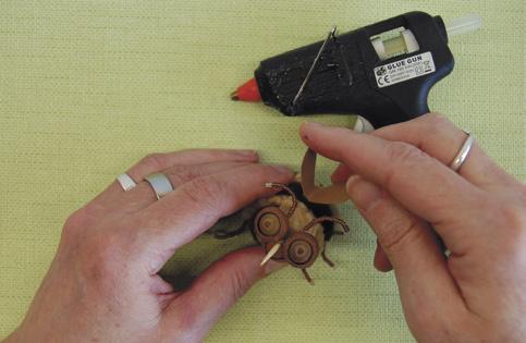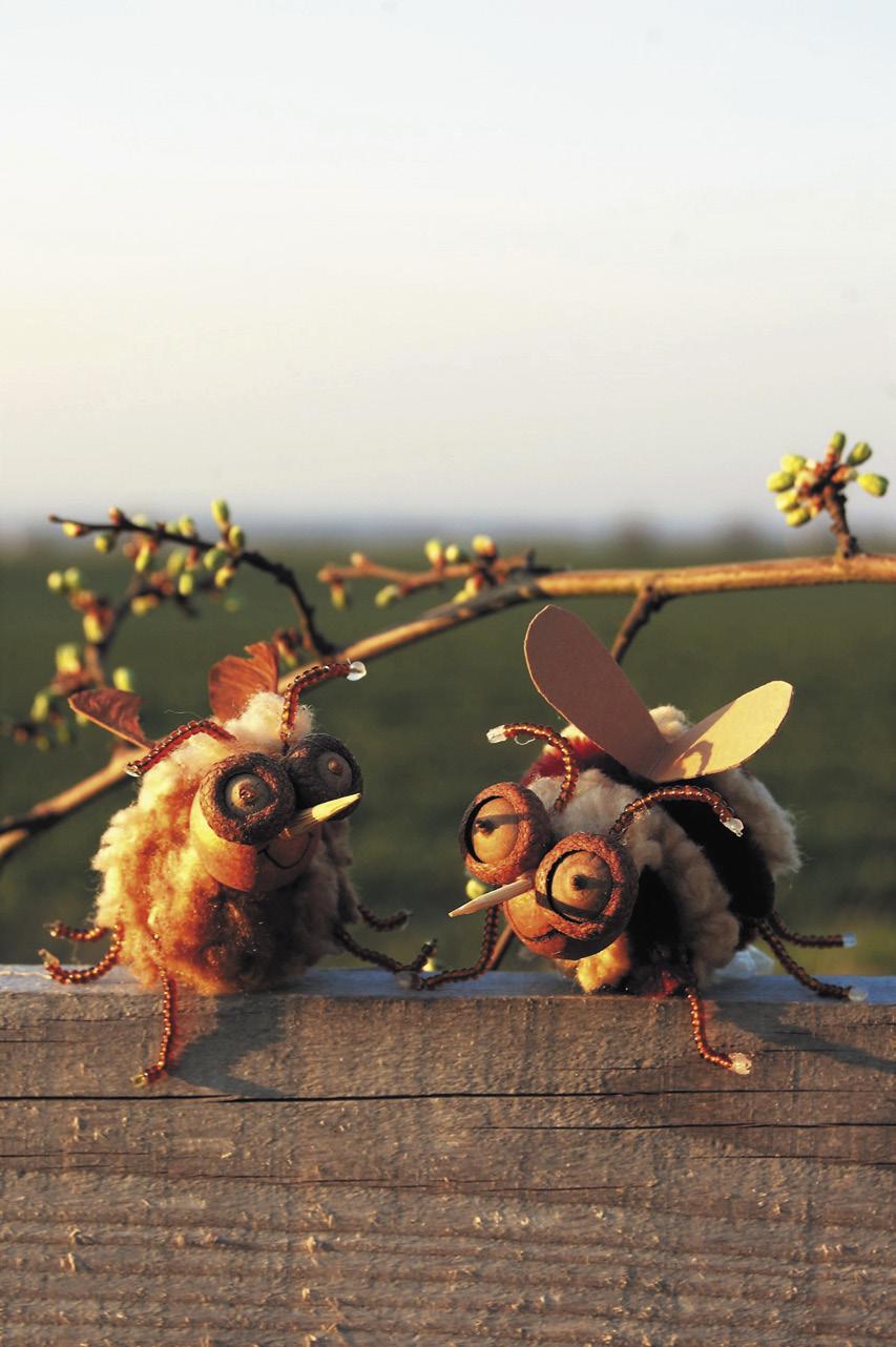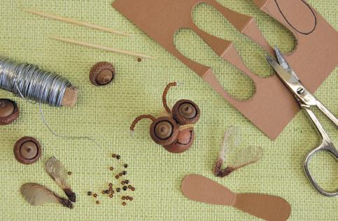 Hlavičku a křidélka přilepte k tělu tavnou pistolí na úplný závěr. Na křidélka použijte javorové nažky (zvané nosy). Nemáte-li je, vystřihněte křídla z papíru. Včelku lze upevnit na drát a využít jako zápich do jarního osení.