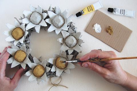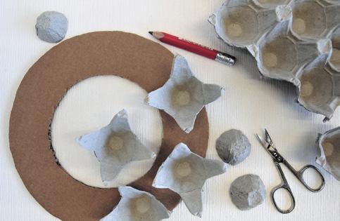 Připravte si: papírové plato od vajíček, nůžky s kulatou špičkou, lepidlo Dispercoll, pevný karton (například z krabice) na vystřižení korpusu věnce, vodové barvy, štětec a kousek provázku.