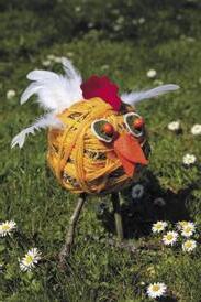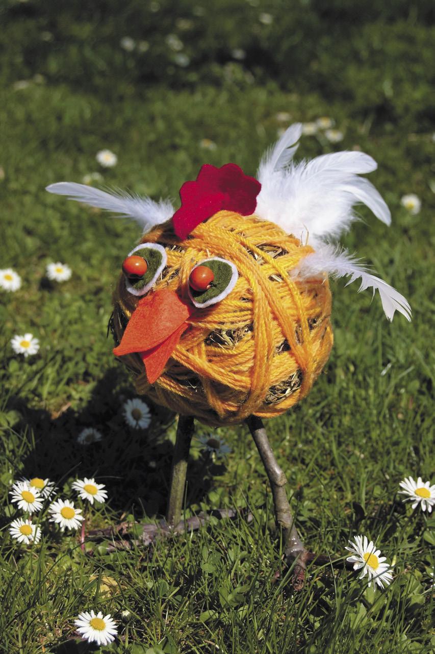Připravte si: seno, vázací drát, žlutou vlnu, větvičky na nožičky, peříčka a tavnou pistoli. Na oči, zobák a kohoutek plst nebo papír, dva korálky a lepidlo Herkules.