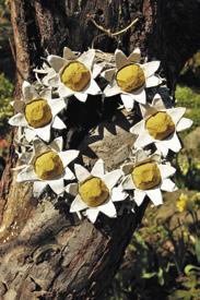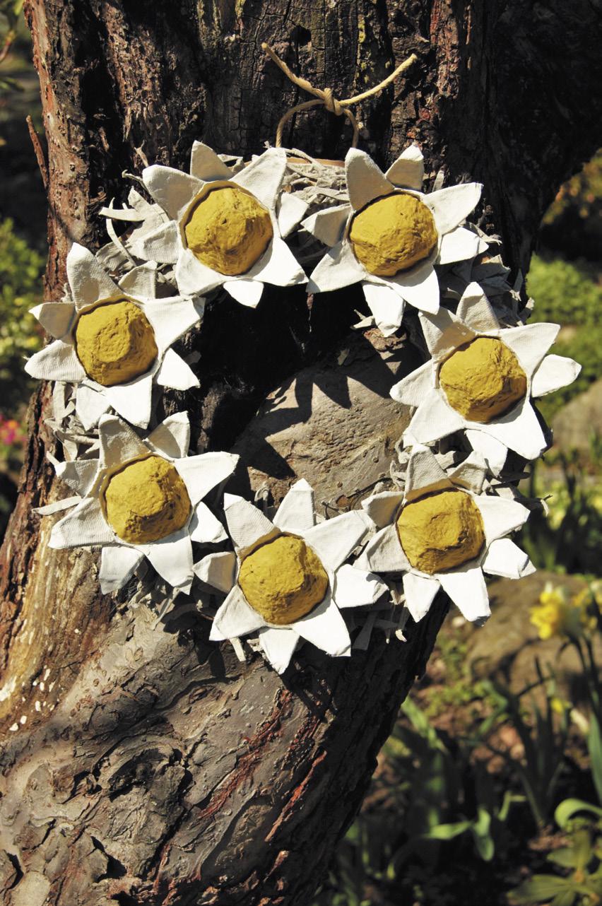 Dva vystřižené kalíšky (okvětní lístky) do sebe vlepte tak, aby se jednotlivé lístky nepřekrývaly. Po zaschnutí vlepte do středu i vystřižené dno. Květy přilepte na vyznačené body na korpusu. Na věnec o Ø 20 cm potřebujete 7 květů.