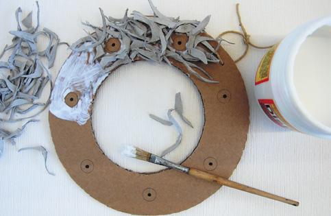 Na korpus vyznačte body pro následné přilepení květů a také jím provlečte provázek na budoucí zavěšení. Lepidlo nanášejte na karton tak, abyste ho stačili zakrýt odstřižky dřív, než zaschne. Po zaschnutí lepidlo zcela zprůhlední.
