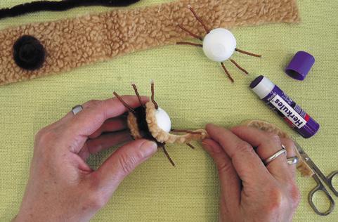 Na obalení těla použijte proužky plyše, chlupatý drátek nebo obojí. Jednotlivé proužky přilepte univerzálním lepidlem Herkules. Proužky lepte dokola mezi nožičkami těsně vedle sebe a nechte zaschnout.
