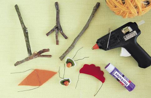 Nožičky si pomocí tavné pistole slepte vždy ze dvou větviček. Na oči, zobák a kohoutek nastřihejte dvojitou plst (nebo papír), přeložte napůl a spolu s vázacím drátem slepte.